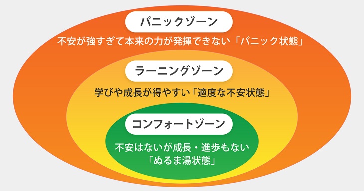 コンフォートゾーン(安全地帯)を抜けて、ラーニングゾーン(適度な不安状態)に行くこと。